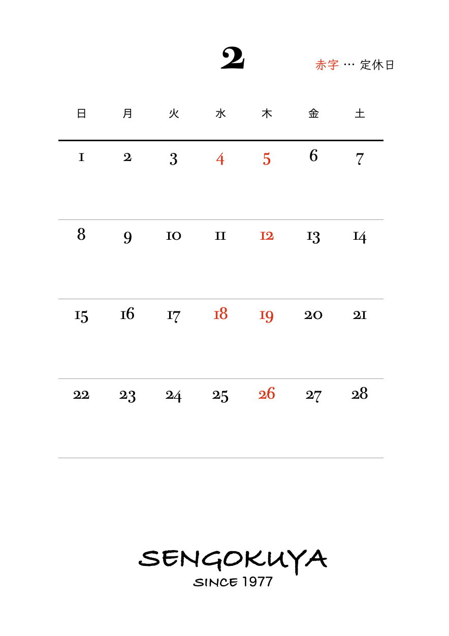2月の営業カレンダーになります。